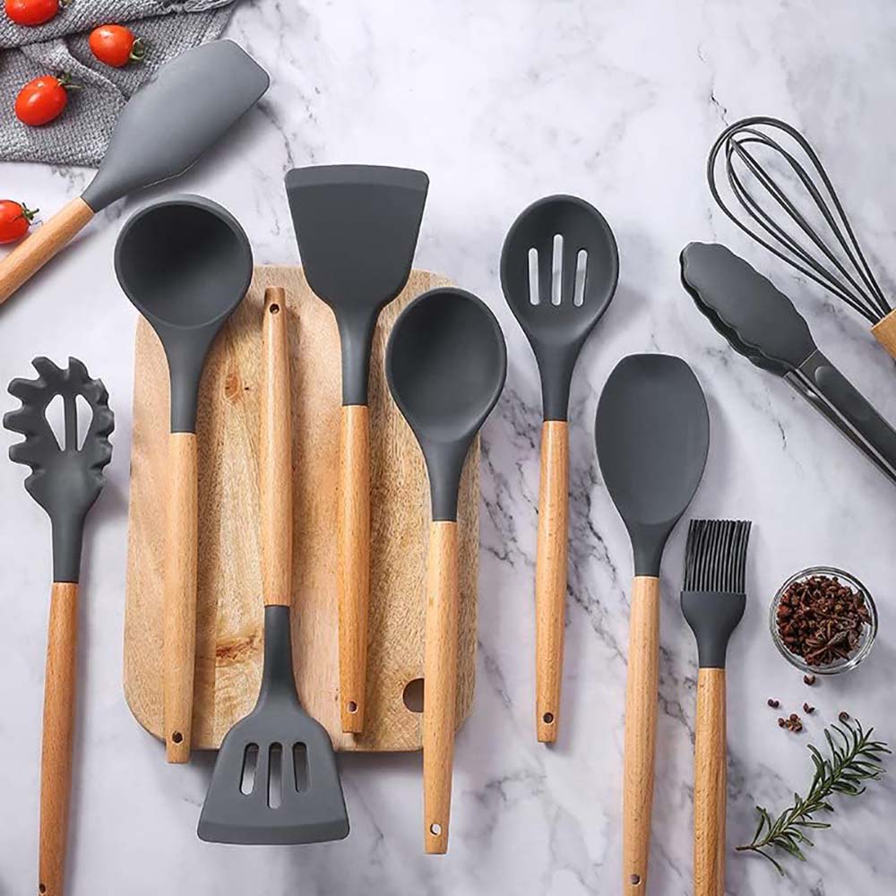 14 darabos konyhai eszközkészlet, hőálló szilikon fejjel, tartóval, sötétszürke