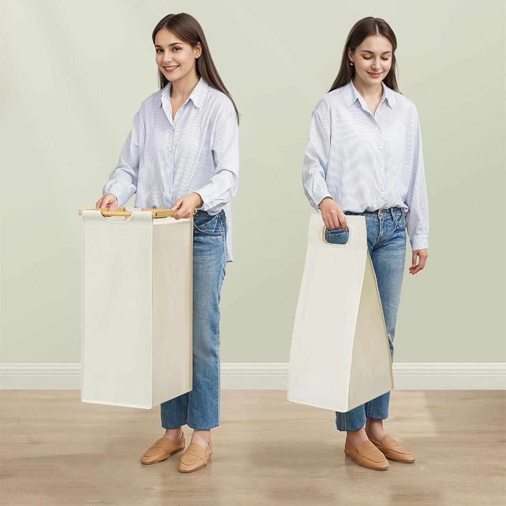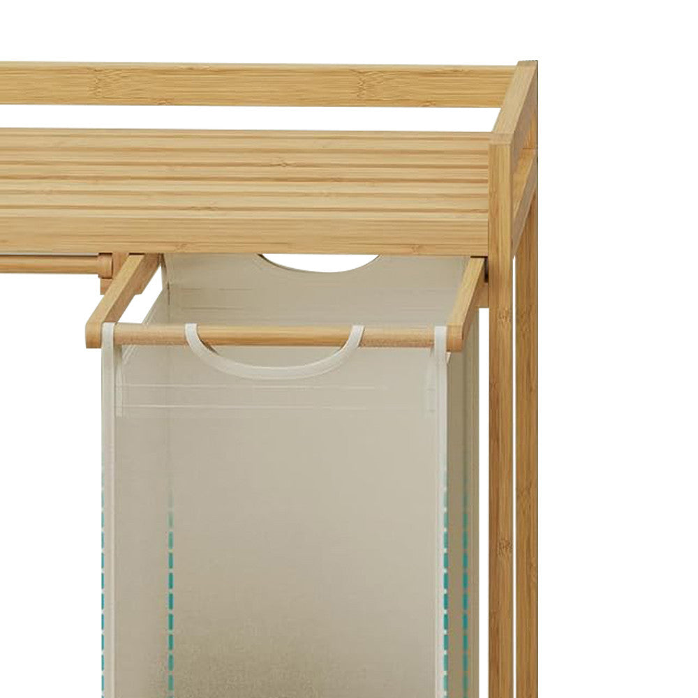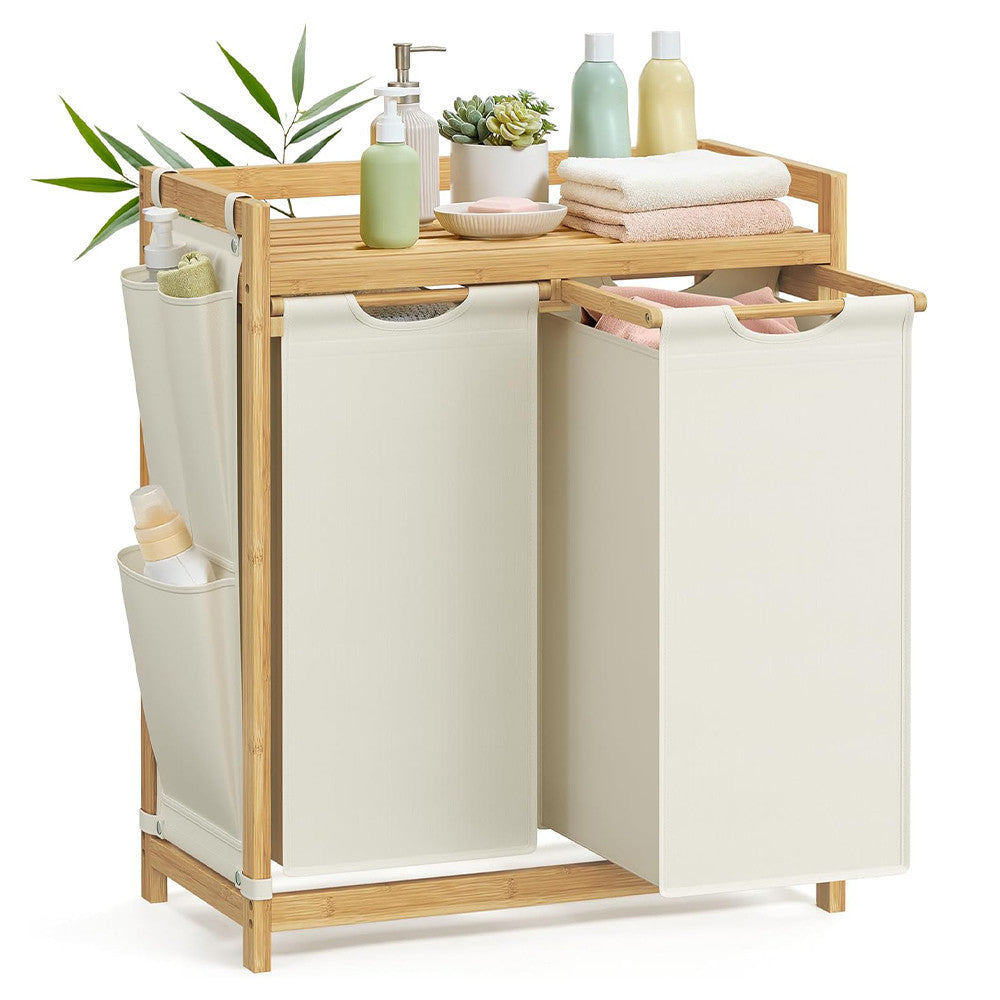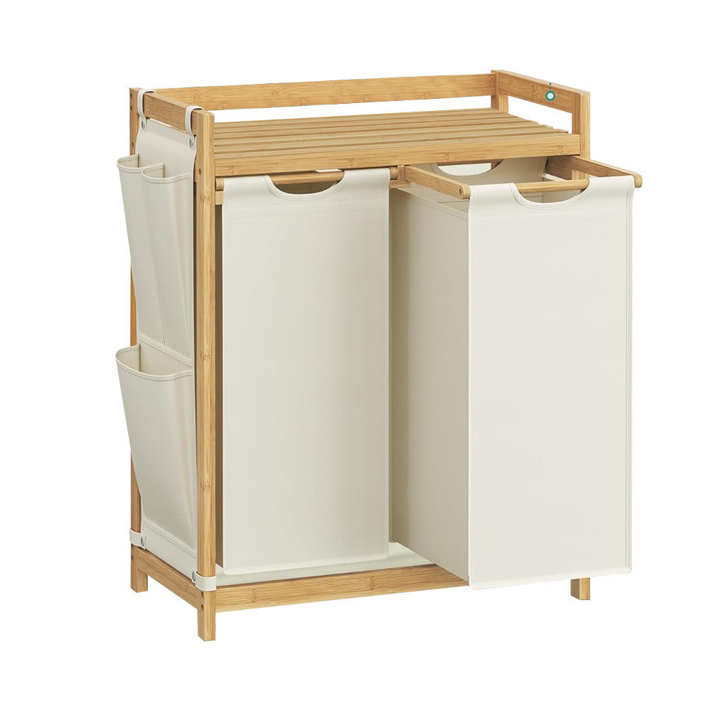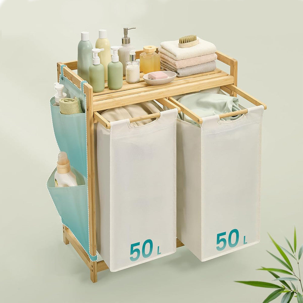 A 2 rekeszes szennyestartó kosár stílusos és praktikus választás mindennapi használatra. Lehetővé teszi a világos és sötét ruhák különválogatását, miközben polca és zsebei extra tárolóhelyet kínálnak. Természetes bambusz váza jól illeszkedik bármely enteriőrbe, így ideális családoknak és rendezett otthonra vágyóknak. | szennyestartó kosár | bambusz szennyestartó