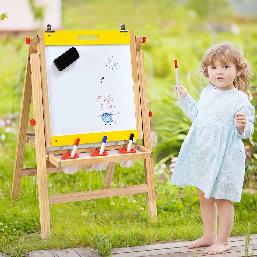 Ez a gyerekeknek készült multifunkciós fa rajztábla kiváló választás közös alkotáshoz és fejlesztő játékhoz. A táblára való rajzolás és írás közben a gyerekek szabadon kifejezhetik kreativitásukat, miközben gyakorolják a helyes ceruzafogást is. Az állítható magasságú, stabil háromszög formájú állvány hosszú távon alkalmazkodik a növekvő gyermekek igényeihez, a bőséges tartozékok pedig teljes körű élményt biztosítanak.