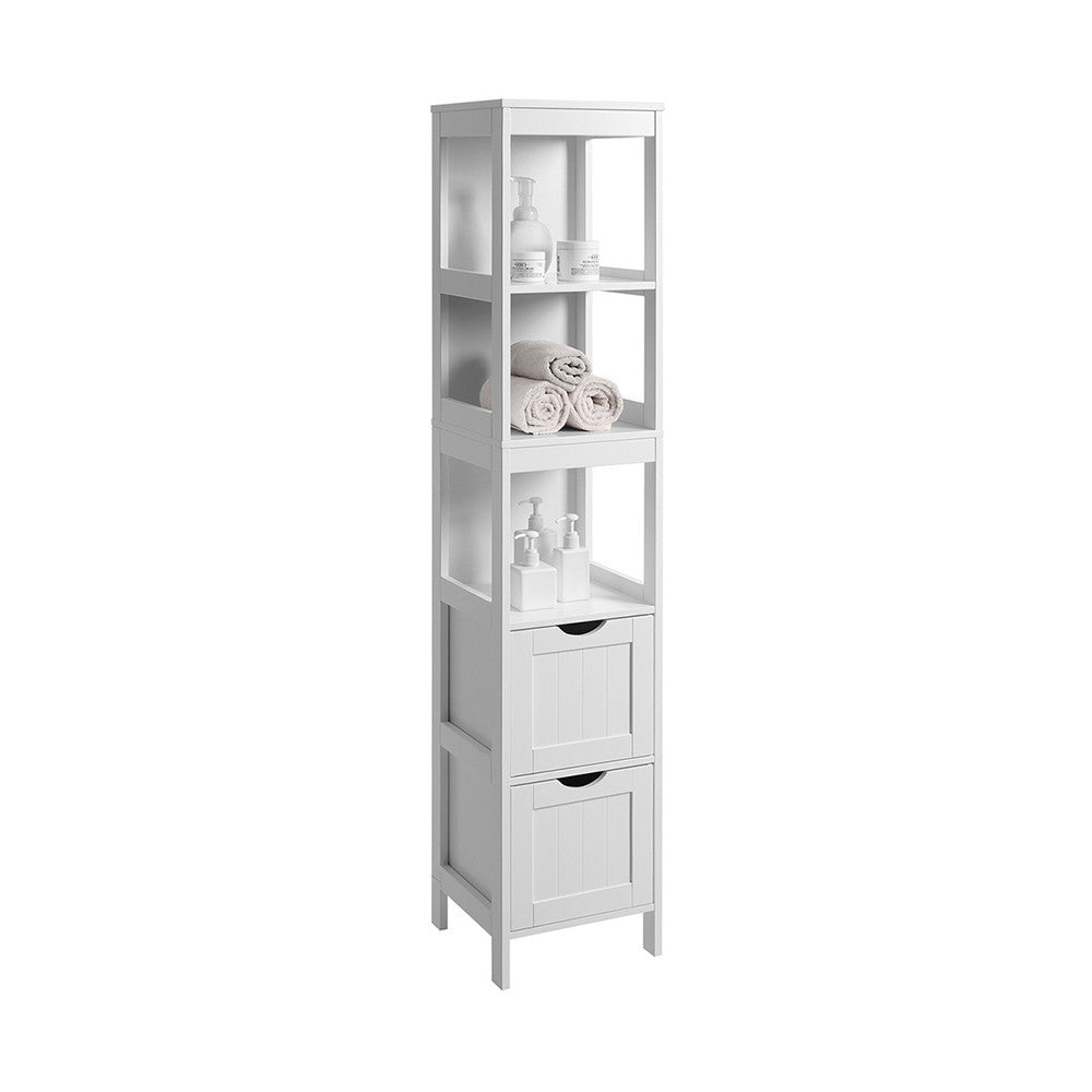 Ez a keskeny, magas fürdőszobai szekrény tökéletes választás kisebb helyiségekbe, ahol fontos a praktikus és ízléses tárolás. Az állószekrény három nyitott polccal és két áthelyezhető fiókkal kínál rugalmas rendszerezési lehetőséget, miközben stabil szerkezete és elegáns fehér színe harmonikusan illeszkedik bármely otthoni környezetbe. A fürdőszoba szekrény könnyen összeszerelhető, így gyorsan használatba vehető. Ideális megoldás, ha esztétikus és praktikus fürdőszobai tárolóra van szükség.