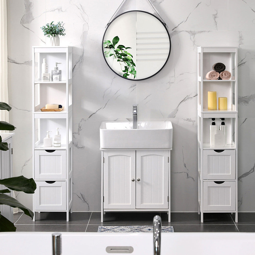 A két levehető fiók szabadon áthelyezhető az alsó nyitott rekeszekbe, így a szekrény testreszabható a különböző tárolási igényekhez. Akár tisztálkodási szereket, akár kisebb törölközőket szeretnél elrejteni, ez a megoldás mindig alkalmazkodik hozzád.