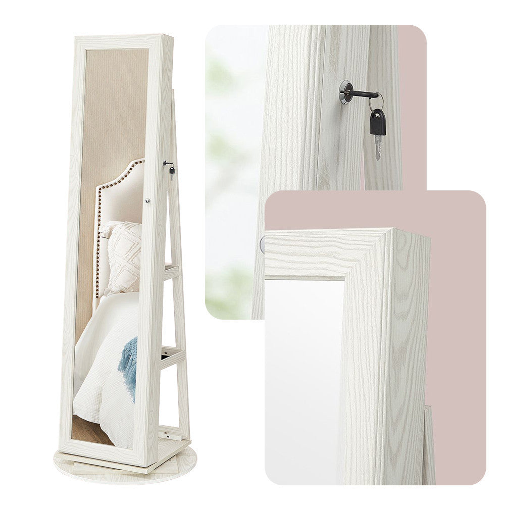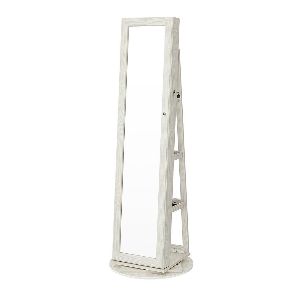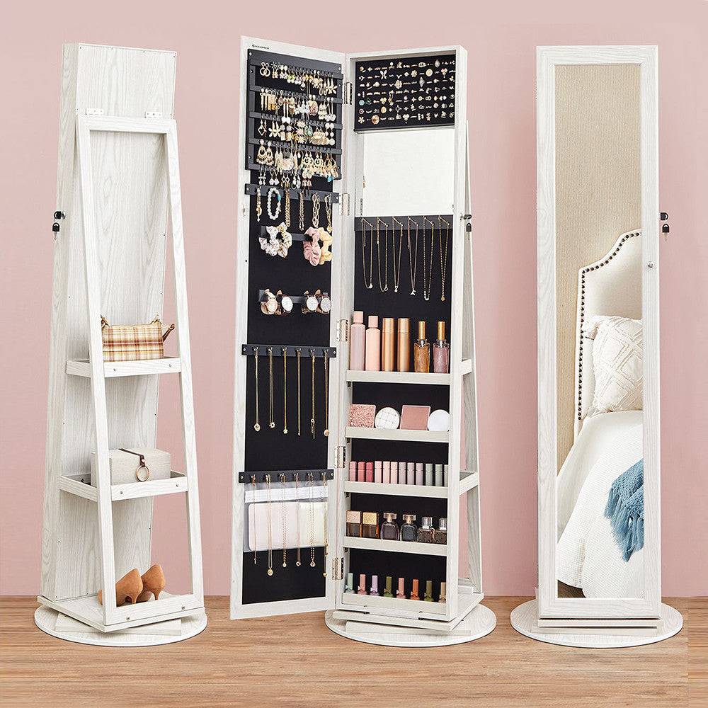 Ez a modern ékszertároló szekrény valódi mindenes_ tükör, zárható ékszerdoboz és tárolópolc egyben. A 360°-ban elforgatható kialakítás megkönnyíti a hozzáférést és segít átlátni az ékszerek és kozmetikumok teljes készletét. Letisztult megjelenésének és praktikus belső elrendezésének köszönhetően tökéletes választás hálószobába vagy gardróbba.