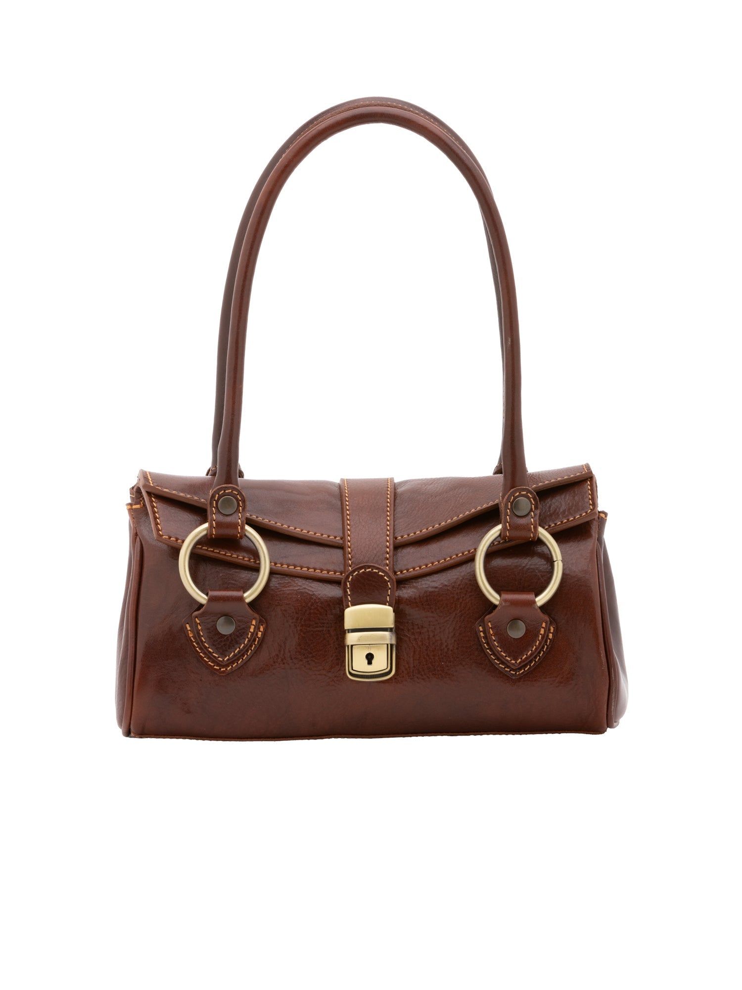 Borsa a bauletto da donna. La chiusura è a scatto. Le tasche interne sono due con zip. Le tasche esterne sono assenti. La tracolla è assente. Il manico è in pelle. Gli scomparti interni sono due. Il materiale esterno è vera pelle vacchetta. Internamente è foderato in cotone. Misure: 29x15x12 cm . Made in Italy