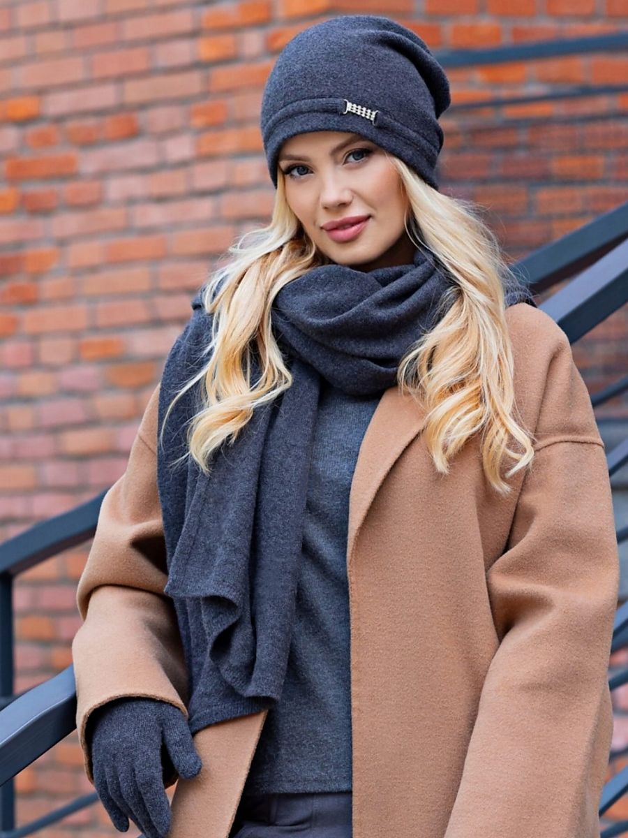 LEONORA women's woolen hat in graphite color with zircons is the perfect addition to an autumn-winter wardrobe. Made of high-quality yarn with a high wool content, it provides warmth and comfort when worn. An ornamental strap with a buckle studded with shimmering crystals adds elegance and a unique character to the hat. LEONORA is a proposal for women who value style and class. The hat is available in many color variations, allowing you to match it to various stylizations. Paired with a scarf and gloves, it creates a perfect set for cold days. Add a touch of sparkle to your autumn-winter wardrobe with the LEONORA hat.