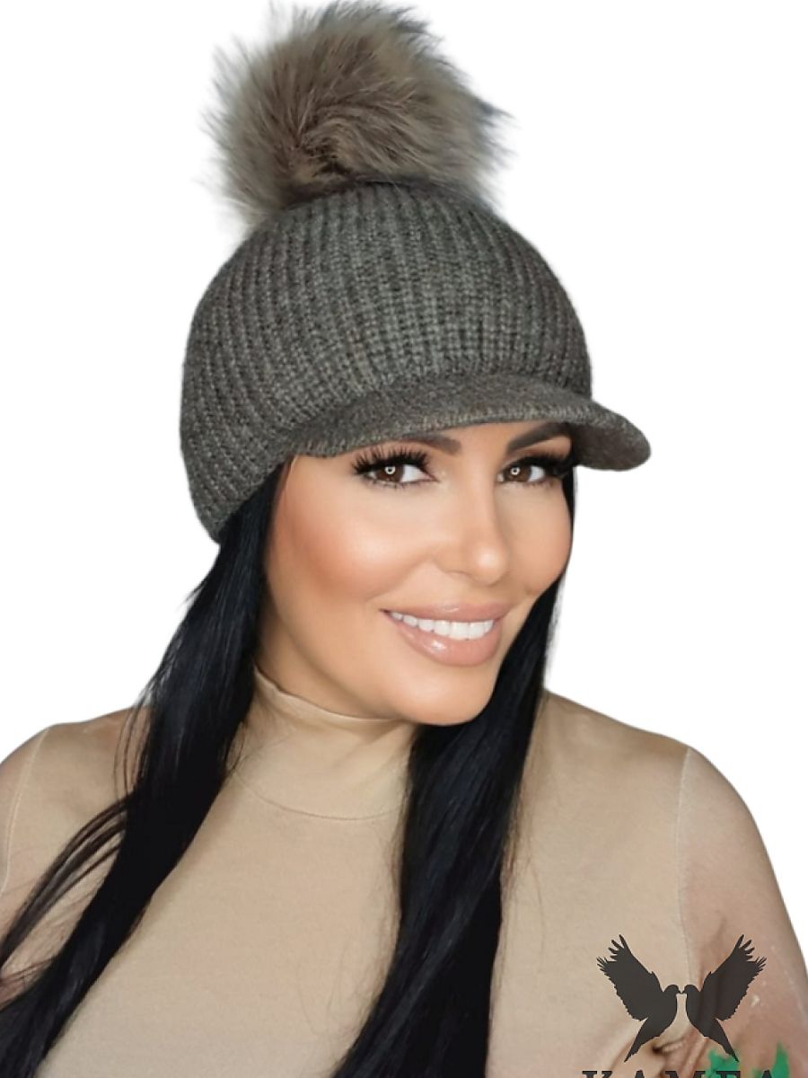 The NASIRA NATURAL POMPON is a winter women's hat in brown, which is perfect for cold days. It is made of high-quality yarn with a touch of mohair wool, which provides warmth and comfort. A characteristic feature of this hat is the visor, which effectively protects the face from wind and blizzard.