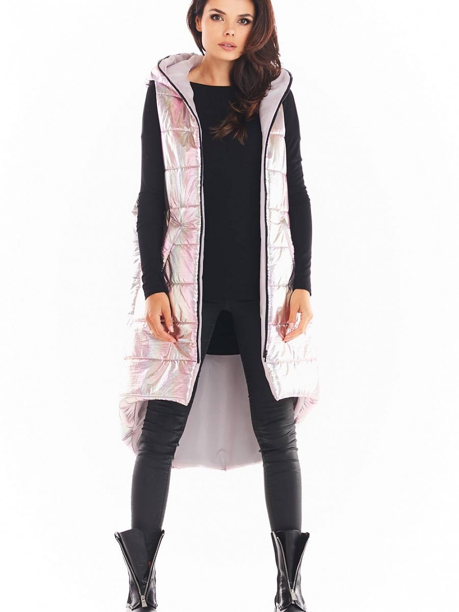Holographic vest with an extended back is a perfect choice for cool autumn days. Its interesting colors will catch the eye and add character to your outfit. Zipped, with a large hood and capacious pockets. It comes in 3 shades: blue, mint and pink. Material: lining 100% polyester.