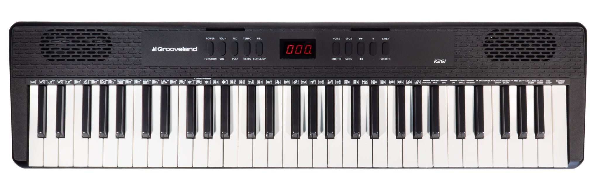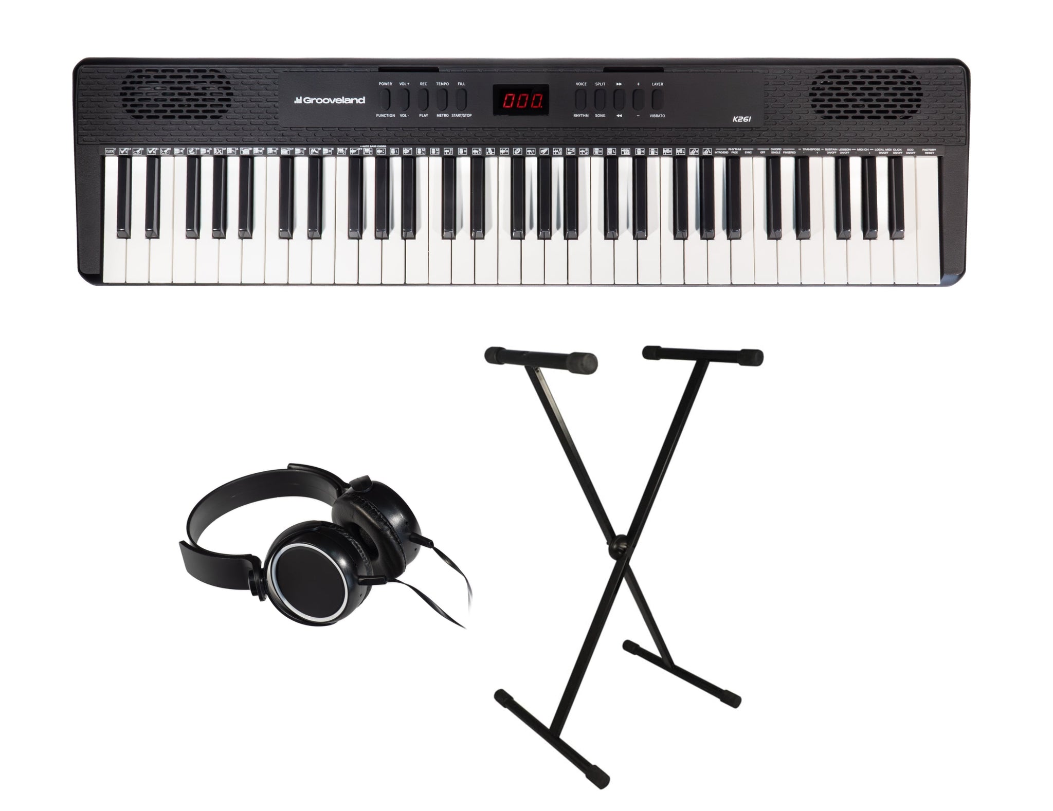 The Grooveland E261 Keyboard Starter Pack is the ideal solution for beginners and experienced musicians who want to start playing right away. This complete package includes the Grooveland E261 keyboard, an adjustable keyboard stand, and a pair of comfortable headphones – everything you need to begin your musical journey.