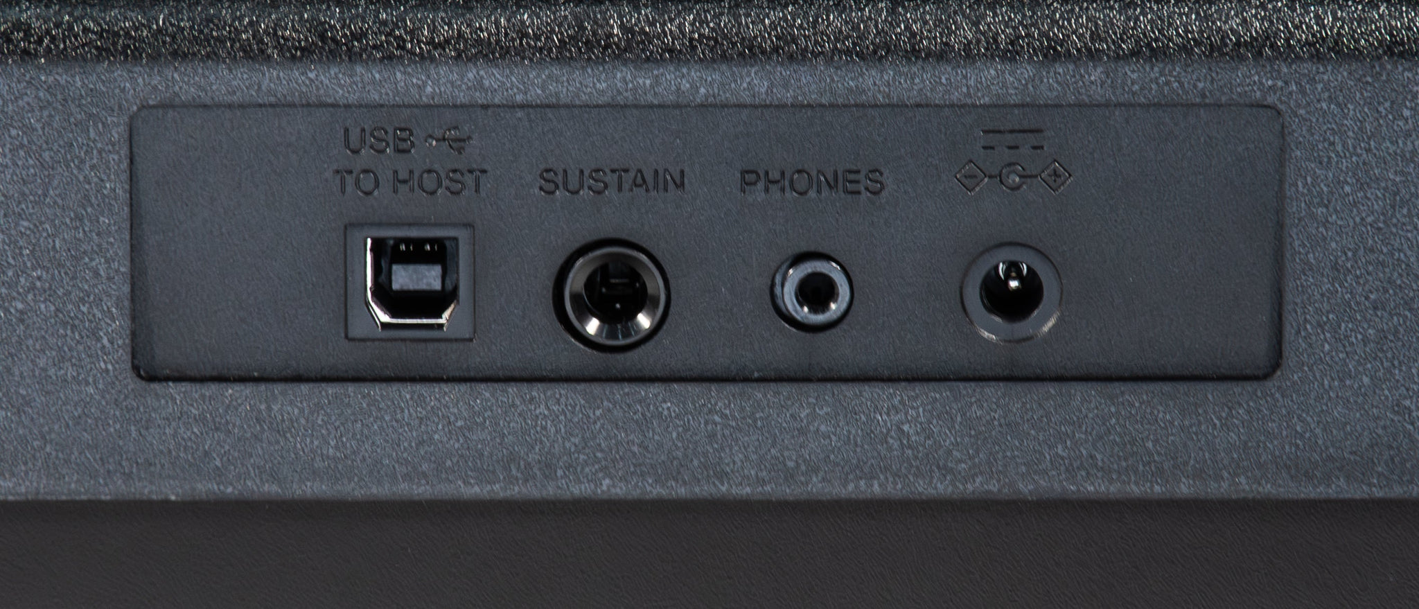 - Connections: USB-B to host, Sustain, Headphone output, Power input