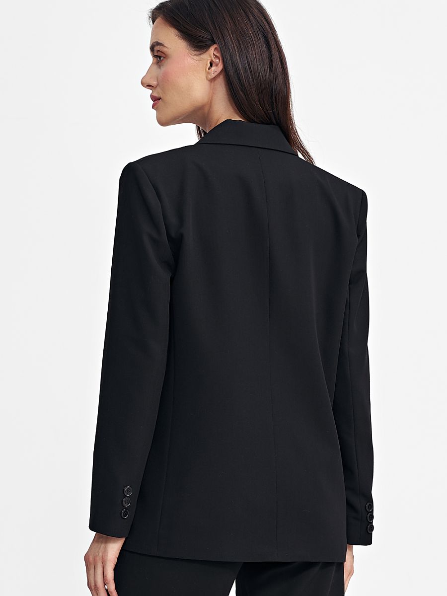A women's oversize cut blazer that combines elegance with modern style. A classic collar with lined lapels adds a formal touch, while long sleeves with buttons at the bottom introduce subtle details. The jacket features shoulder pads for a more defined shape and elegant texture. Reaching past the hipline, the length makes it versatile and stylish. The double-breasted front button closure accentuates its classic charm, while the lining provides extra comfort and an elegant finish. Perfect for creating both casual and more formal looks.