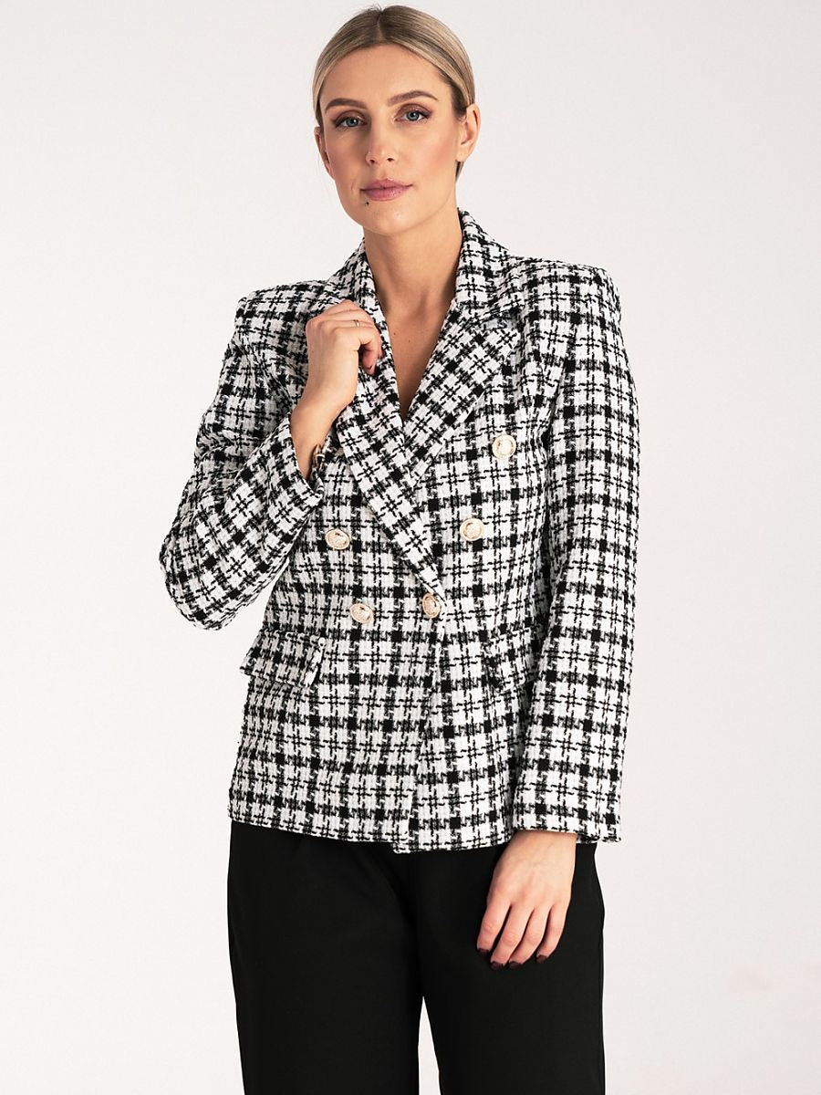 Two-row jacket in checkered pattern made of elegant jacquard fabric. Jacket with classic collar fastened with golden buttons.