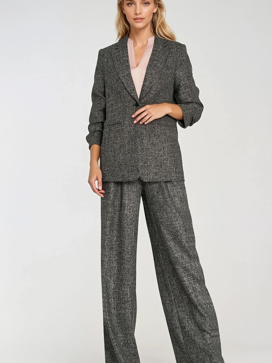 Stylish women's blazer with a regular, loose cut, made of material with a mottled texture and uneven color, which gives it a modern character. The model has lapels and 3/4 sleeves with delicate pleats, adding lightness and elegance to the whole. The blazer is fastened with one button, and there are imitation pockets on the front. Shoulder pads subtly emphasize the silhouette line, and the full lining ensures comfortable wearing and an elegant finish. Excellent for both casual and more formal styling.