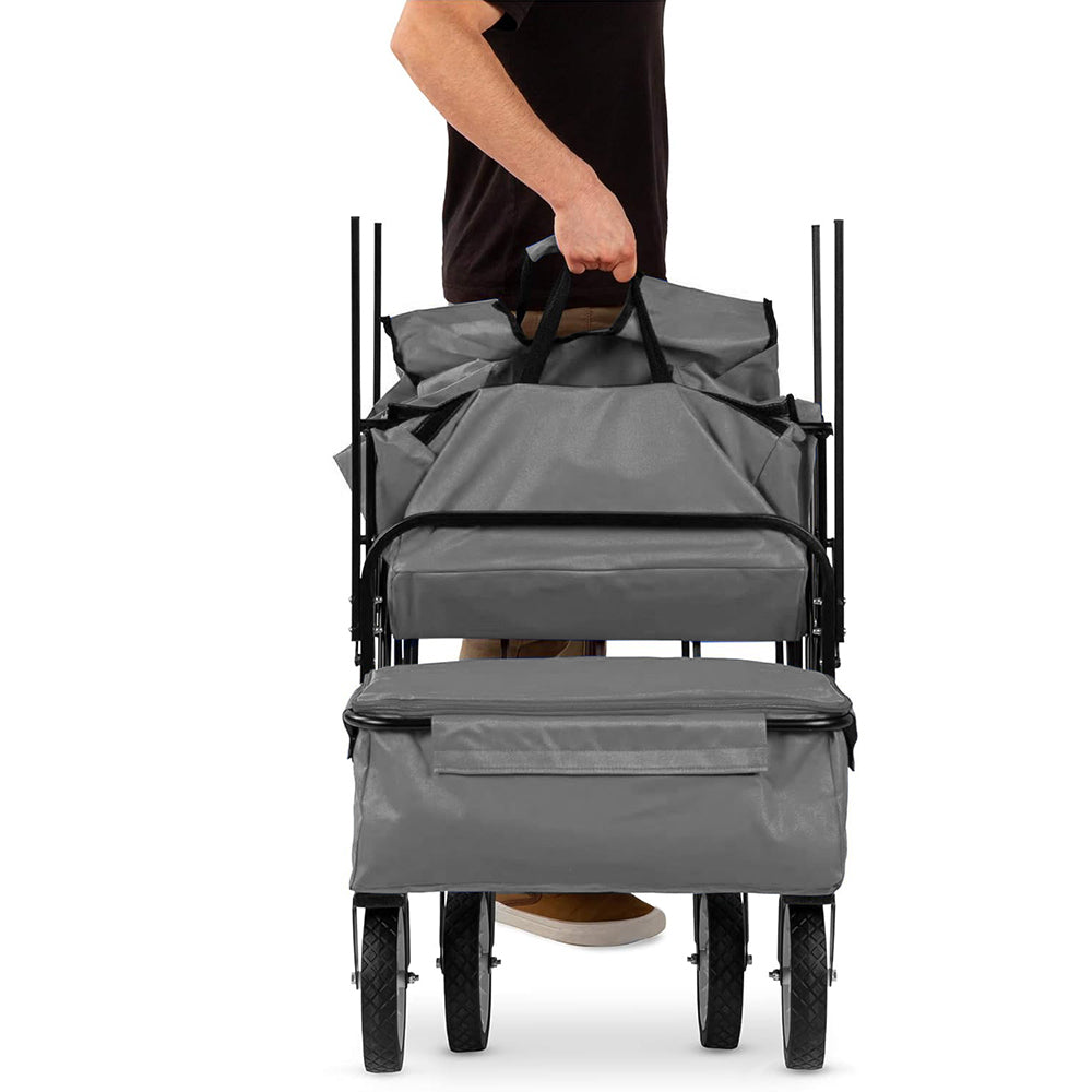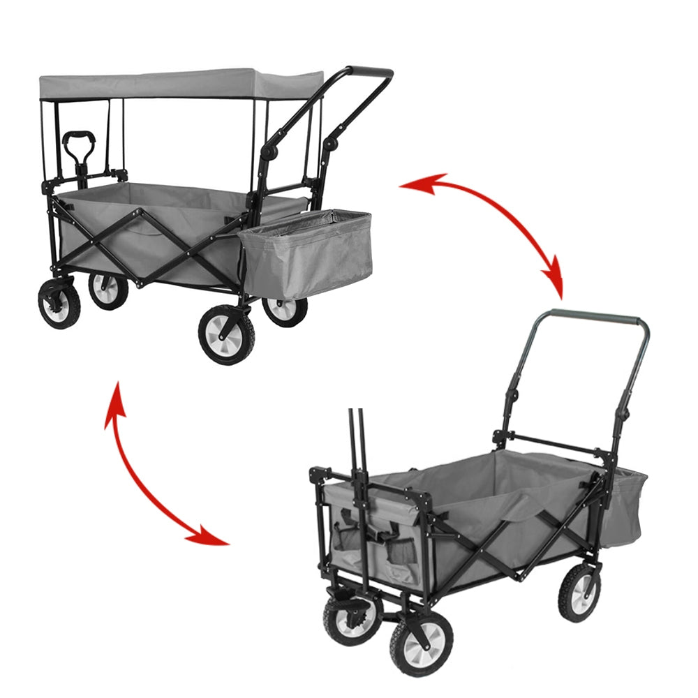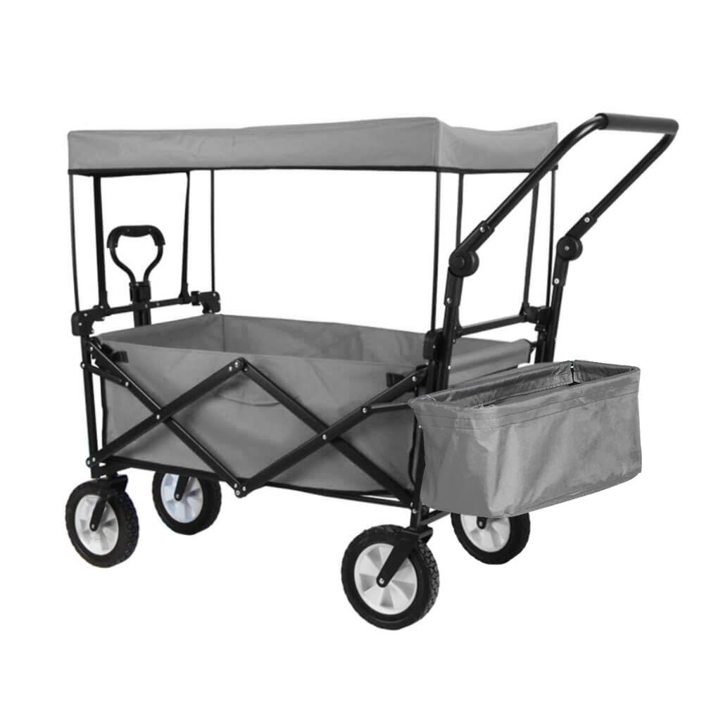 Erős, 100 kg teherbírású kézikocsi levehető tetővel, oldalzsebekkel. Ideális kerti munkához, kiránduláshoz vagy horgászathoz. Egyszerűen tárolható.