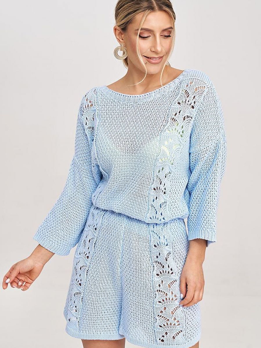 Two-piece set consisting of a blouse and shorts. The blouse is decorated with knit inserts at the front. The blouse has 3/4 sleeves and a round neckline. The shorts feature lace inserts.