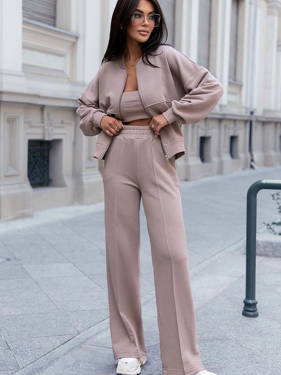 Misty two-piece sweatshirt set! This season's most fashionable bomber sweatshirt combined with wide-leg pants is a set that you will use in your styling all year round! The bomber is perfectly tailored. Sleeves and hem finished with a wide welt. Fastened with a metal zipper. It has a lowered shoulder line and fashionable stitching. Wide, straight-leg pants with decorative stitching that optically lengthens the legs, have slip pockets. The set is sewn from 310 g loop tracksuit, non-insulated, breathable, cotton material. The set was designed and sewn in Poland.