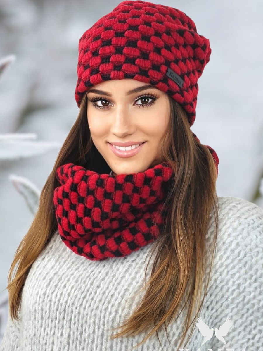 BOSTON winter set in red is the perfect solution for cold days. It consists of a hat with a fleece trim and a tube scarf. Made of high-quality yarn, providing comfort and warmth. The hat is decorated with a logo made of eco leather, adding elegance to it. The product is intended for autumn and winter, available in various colors. An ideal choice for any woman who values not only style but also functionality.