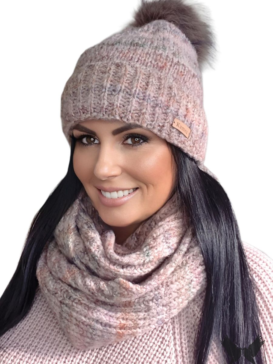 GAJA is a set consisting of a hat and a neck warmer in pink color. Both elements are made of high quality yarn, and the inside of the hat is additionally lined with soft fleece. The products are characterized by harmonious, intertwined colors, and the hat is adorned with a large, fluffy pompom. Additionally, there is a leather, branded badge on the side. GAJA is an ideal proposition for cold autumn-winter days. The set is available in many color variations, allowing you to match it to various stylizations.