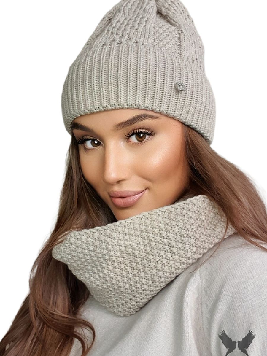 SAFONA women's set is a great proposal for autumn and winter. Products made of beautiful shapes and thick weaves provide warmth and comfort of use. A hat with a wide cuff over the forehead and a neck warmer in a uniform beige color emphasize the charm of fantastic patterns. The soft material guarantees warmth and comfort of wearing. The set perfectly matches any styling, making you look stylish and trendy. Available in several color variants, the SAFONA set is a product of the KAMEA brand, which guarantees the highest quality.