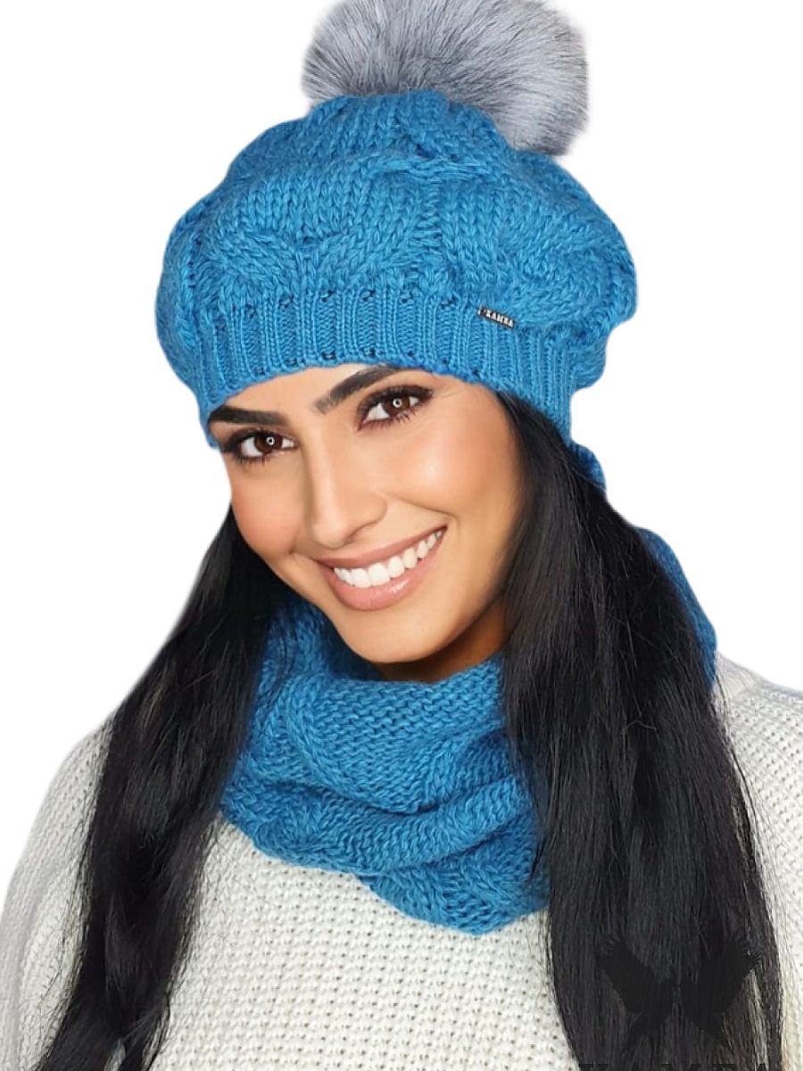 ZITA-KOMPLET women's beret with a turquoise collar is an original, warm and stylish set, which consists of ZITA hat and GITA collar. It is made of high-quality wool yarn, which makes the products not only soft and pleasant to the touch, but also perfectly provides thermal comfort. They are characterized by beautiful, thick weaves and a large, furry pompom on the top of the hat. ZITA-GITA set will be perfect for the autumn-winter season and is available in several color variants. KAMEA brand products guarantee the highest quality.