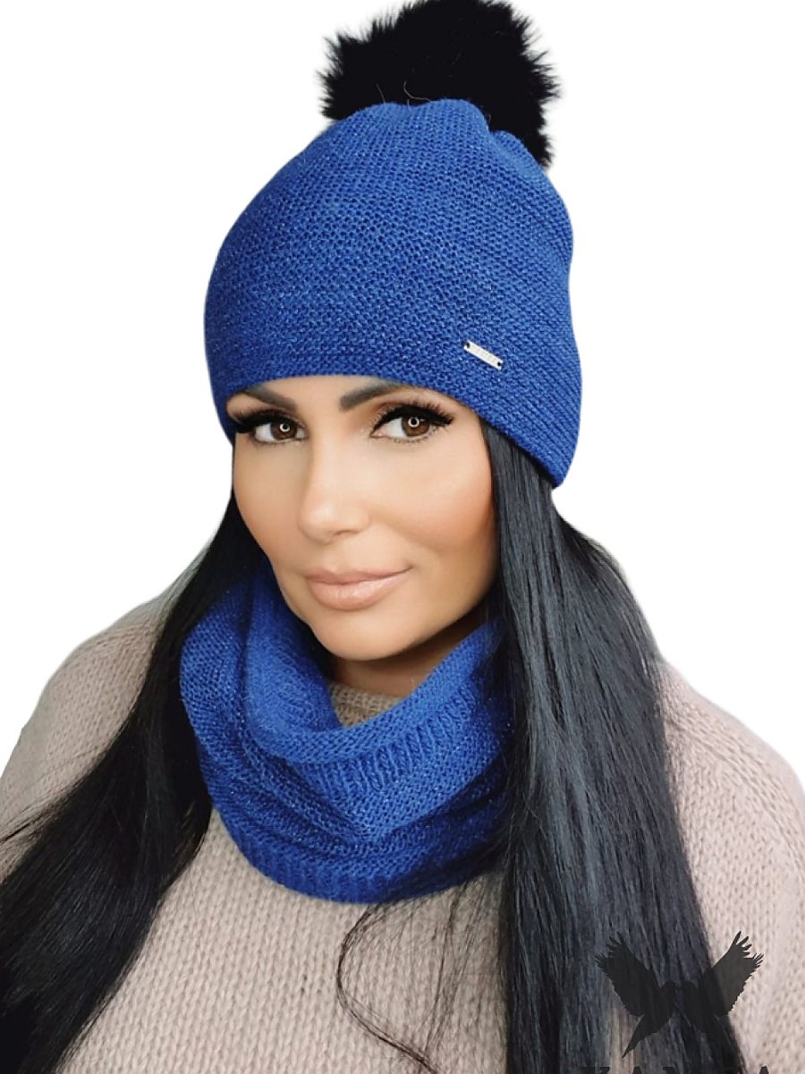 RAVELLO women's winter set in navy blue is an excellent proposition for every woman who values elegance and warmth on cold days. Made of high-quality yarn with the addition of alpaca wool, the set provides excellent thermal comfort. An additional shine and charm are given by a silver, lurex thread woven into the material. A large, fluffy pompom on the top of the hat adds character to the whole look. The product is not only soft and pleasant to the touch, but also available in a rich color palette. KAMEA products guarantee the highest quality, so you can be sure that this set will be the perfect choice for winter.
