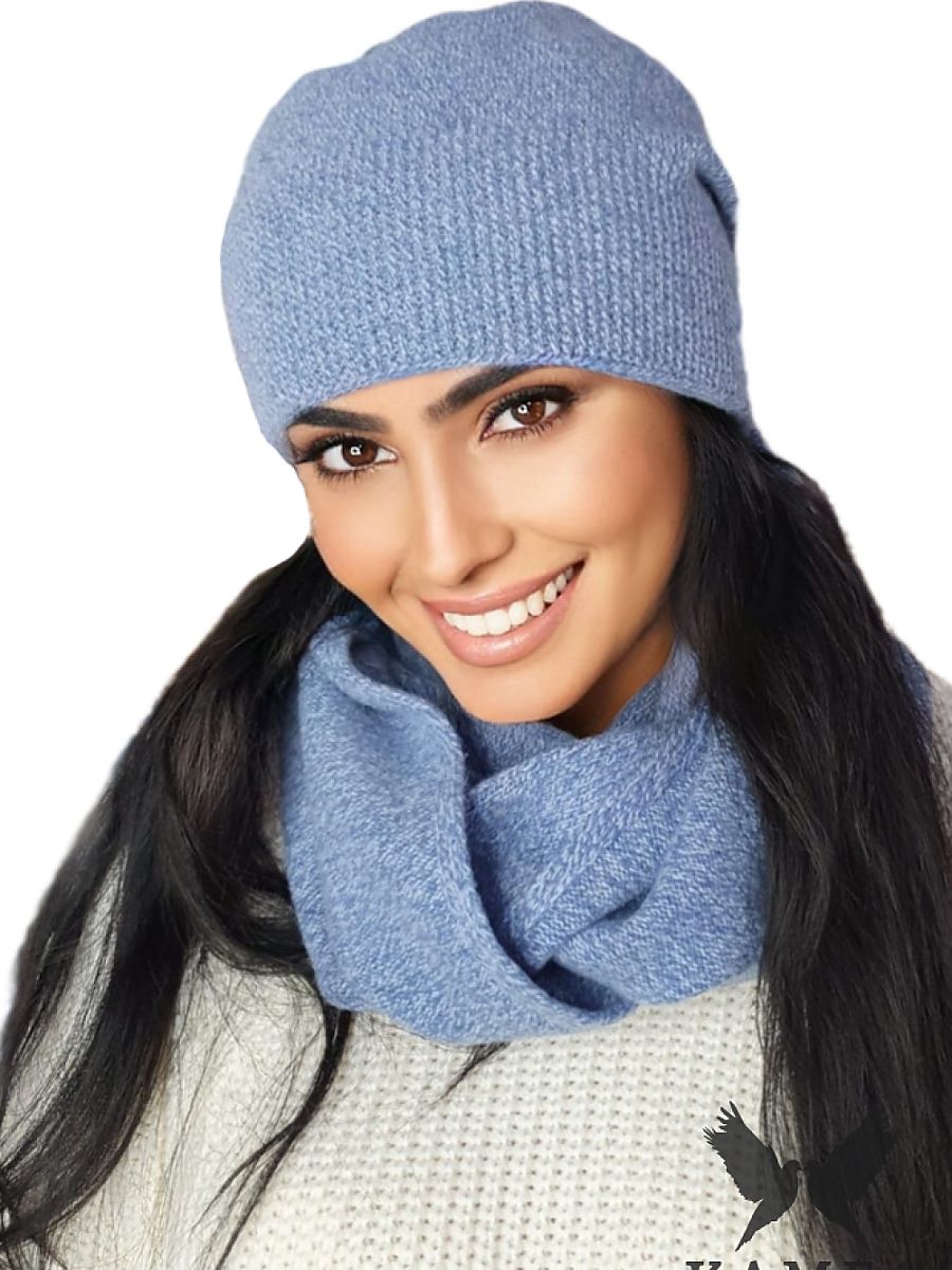 A stylish winter set for women in jeans color is a perfect choice for those who value elegance and high quality. Made of soft wool yarn, it provides warmth and comfort. The hat with a collar fits perfectly on the head and wraps around the neck, adding not only warmth, but also a stylish finish. The product is characterized by an aesthetic shape, excellent weave, and ornamental edges. Available in several color variants, perfect for autumn-winter days. The whole set was produced in Poland, guaranteeing high quality materials and craftsmanship.