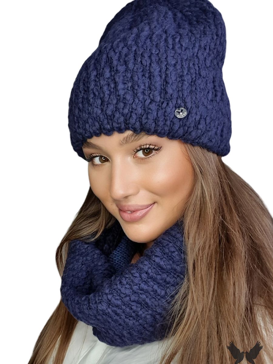 LAMIA-SET is an extraordinary, woolen women's set consisting of a hat and a scarf in navy blue. The finesse of artistic weaves combined with a subdued color make the set both lively and dynamic, as well as balanced. Made of high-quality woolen yarn, it provides invaluable comfort and warmth, while looking stylish. This unique set was produced in Poland, which further emphasizes its value. An ideal choice for cold winter days, adding elegance and style to any outfit.