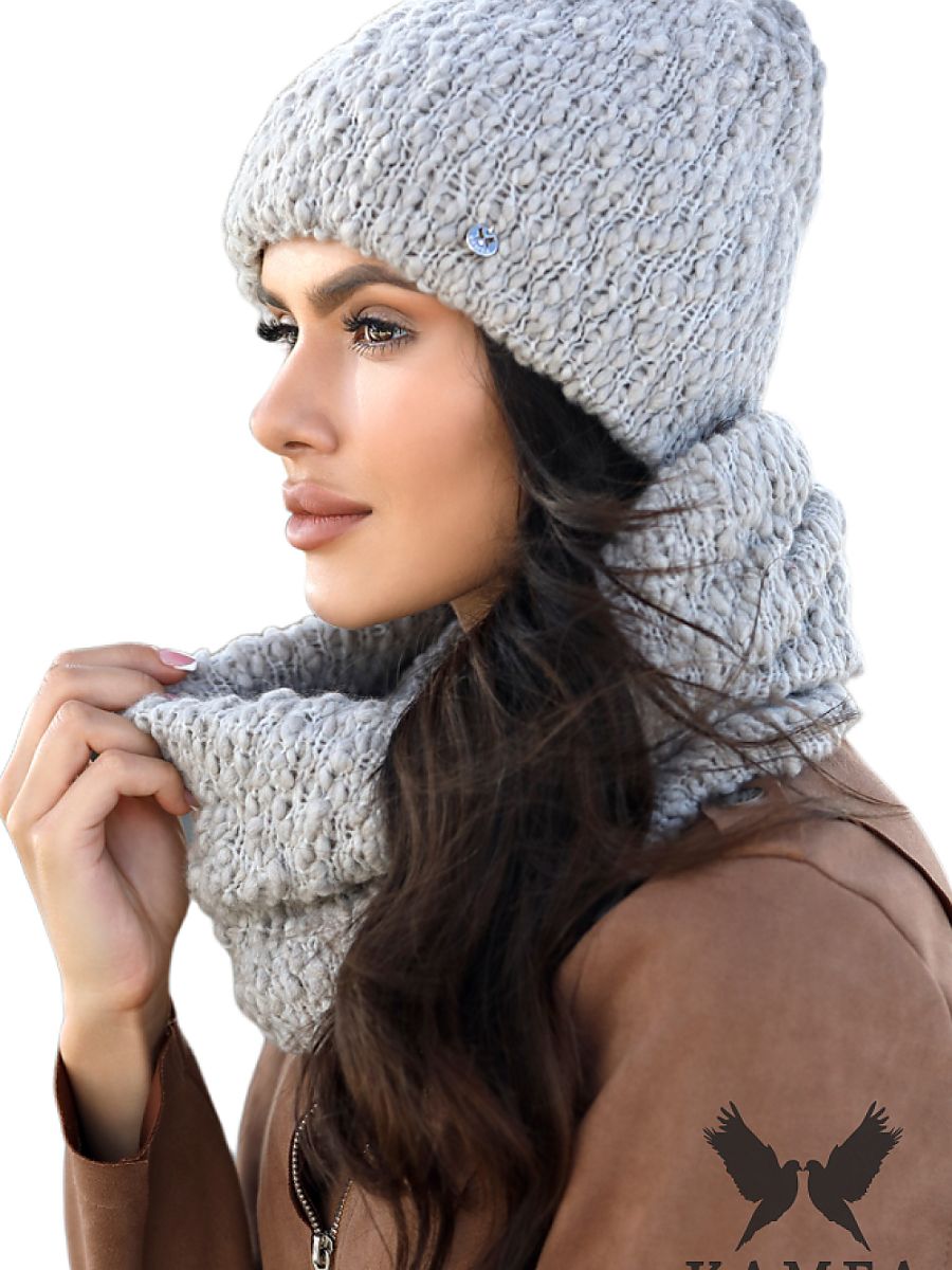 LAMIA-SET for women in beige is an extraordinary winter set consisting of an elegant hat and a scarf. Delicate artistic weaves combined with a subdued color create a composition that is both dynamic and balanced. Made of high-quality wool yarn, the products provide not only warmth and comfort, but also an excellent look. This unique set was produced in Poland, guaranteeing its high quality.