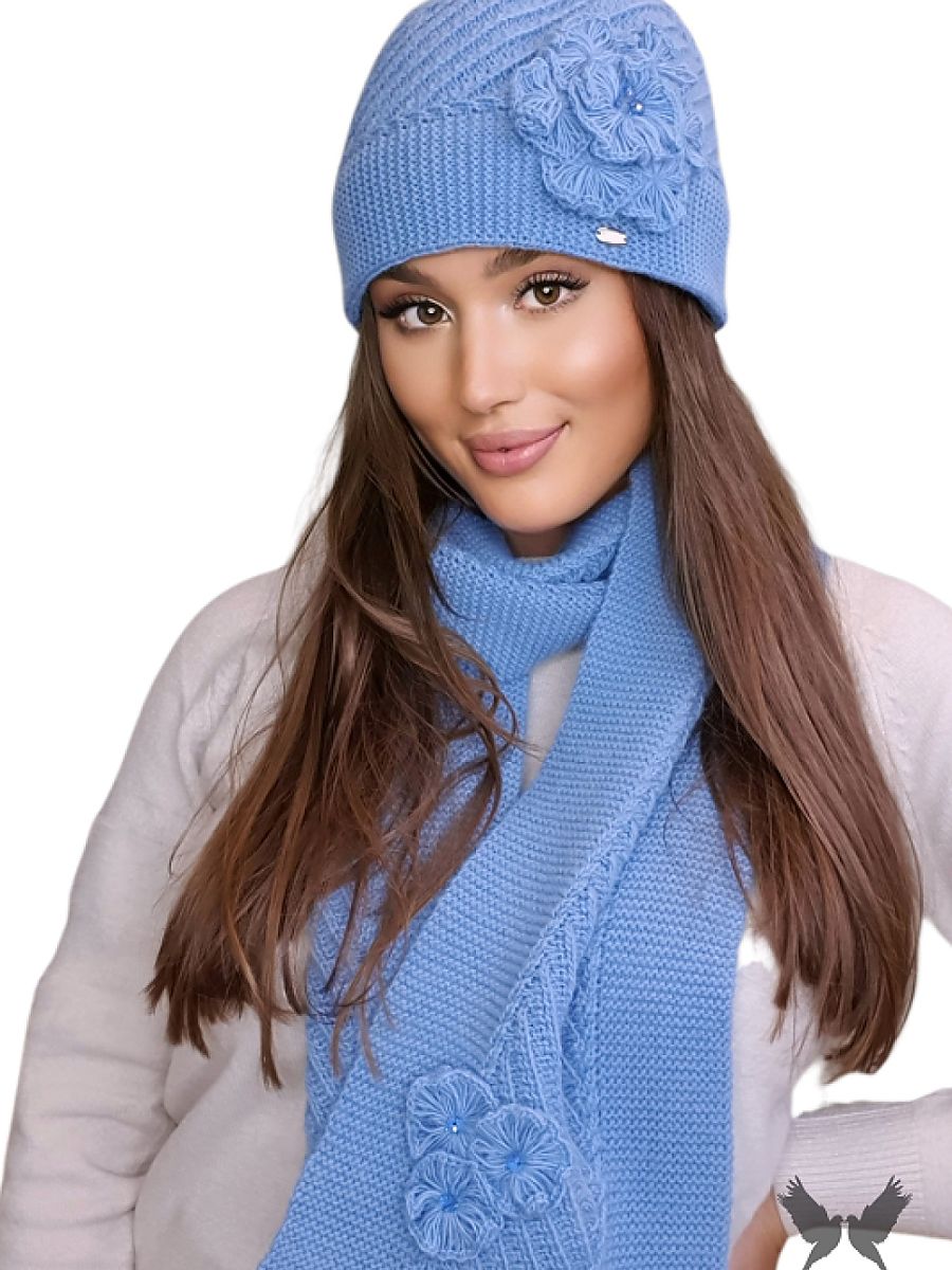 EMMA-COMPLETE women's winter set in blue is an ideal proposal for women who value originality and high quality workmanship. It consists of a hat and scarf, which provide unparalleled comfort and warmth in the winter season. Made of high-quality woolen yarn with the addition of alpaca wool, the EMMA set impresses not only with its design, but also with intricate weaves and intricate flower-shaped bead applications.