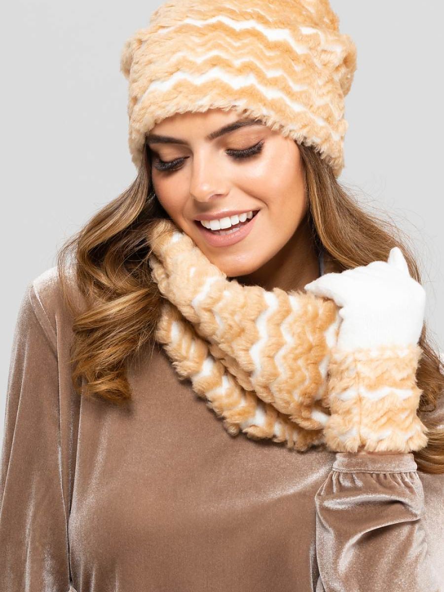 The fur pattern in an attractive beige color gives the products a unique charm that attracts attention. The hat is sewn with seams at the back, guaranteeing a very good fit on the head, while the neck warmer pleasantly wraps the neck on cold days.