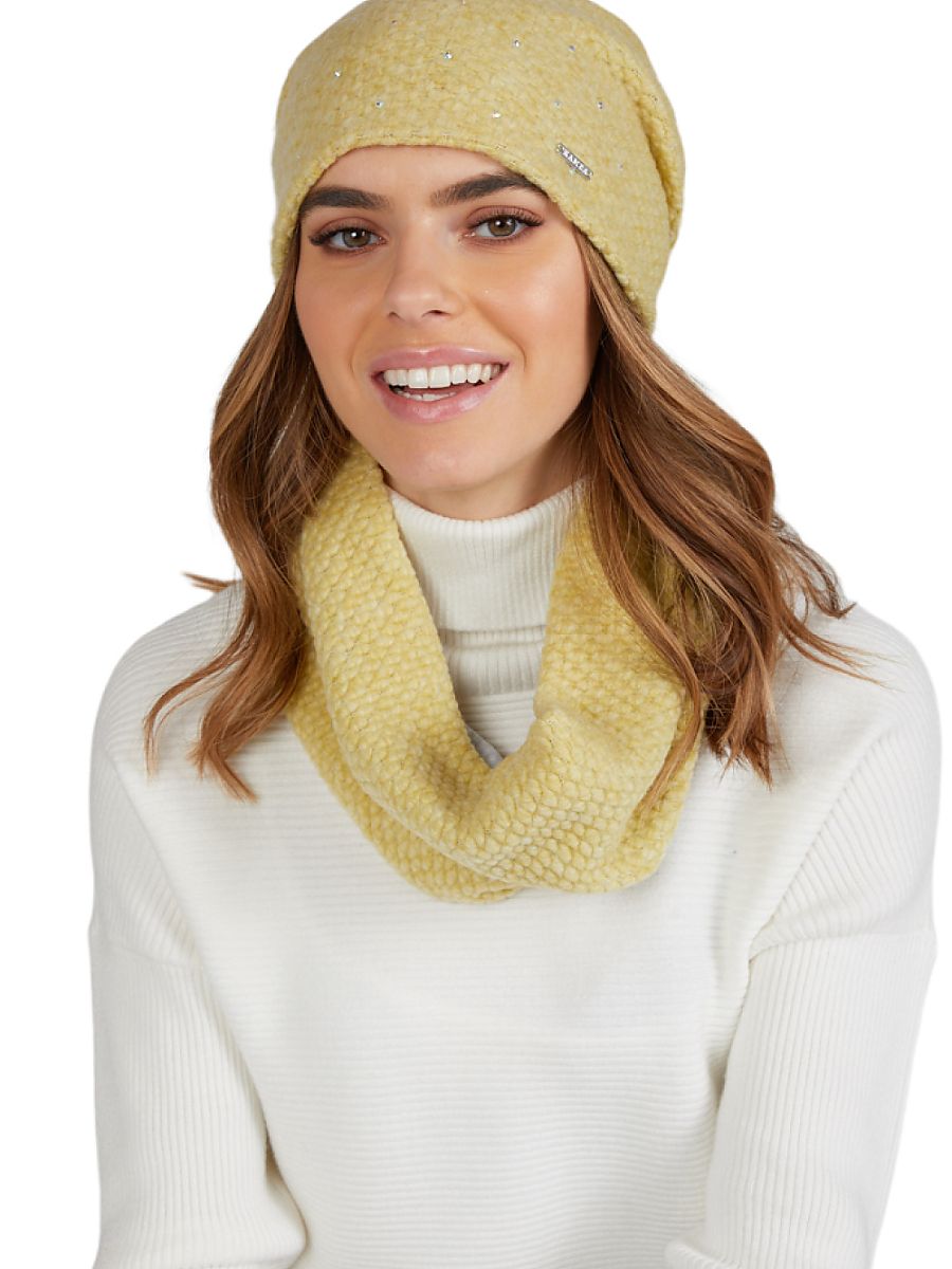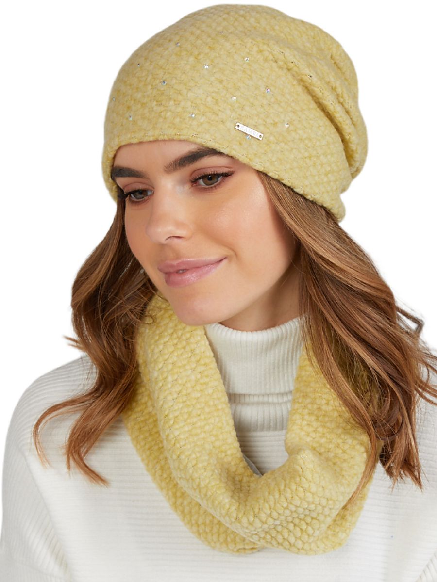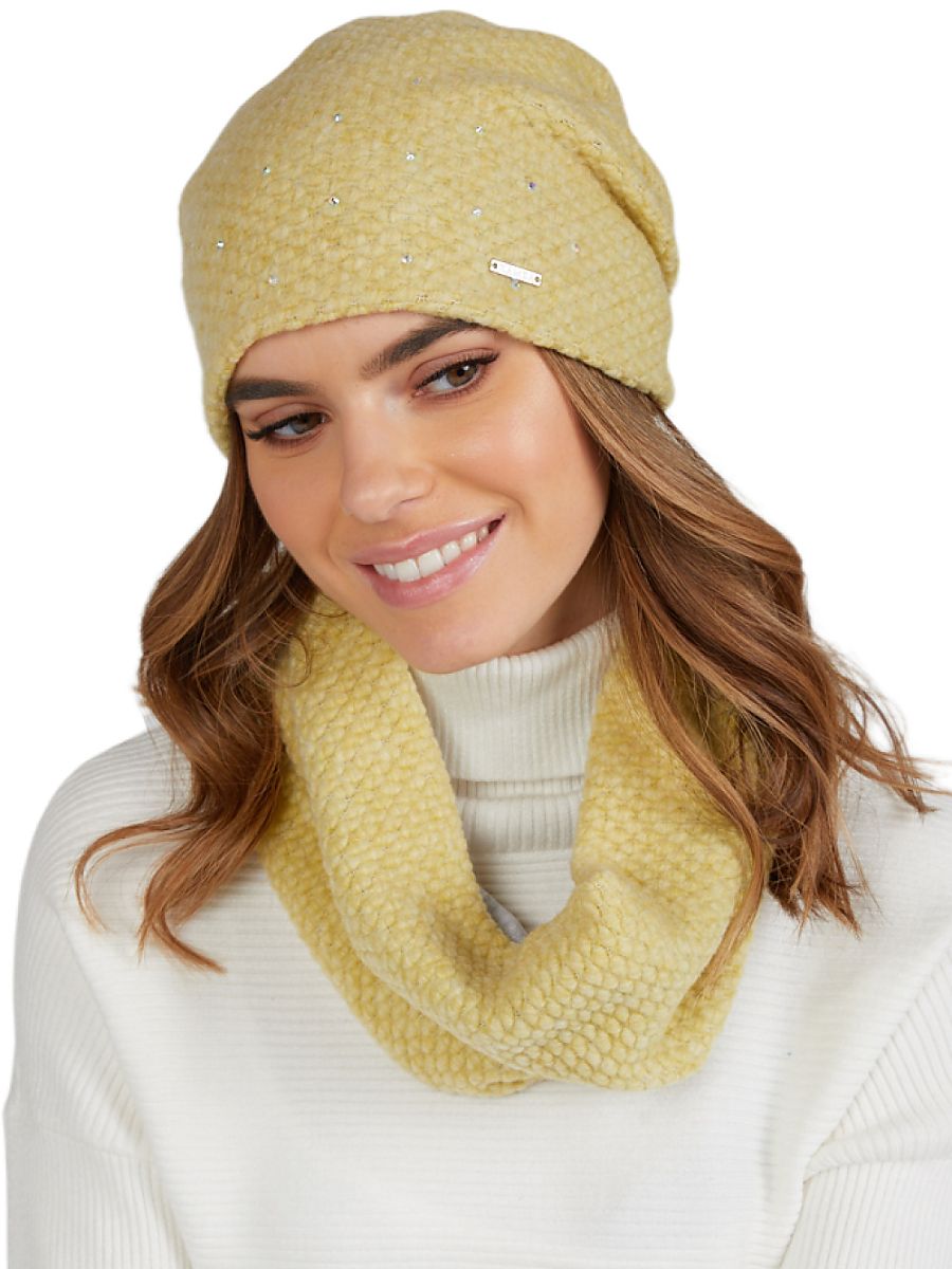 MUSCA women's winter set in yellow is the perfect choice for all women who want to feel stylish and warm on cold days. It consists of an elegant hat and a scarf, both insulated with a soft and pleasant to the touch lining. High-quality, warm yarn ensures wearing comfort, and the universal shape makes the set perfectly adjustable to any silhouette.