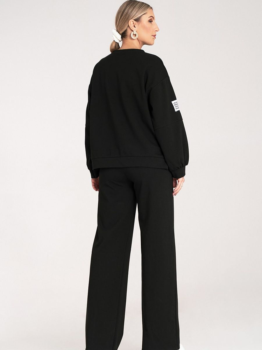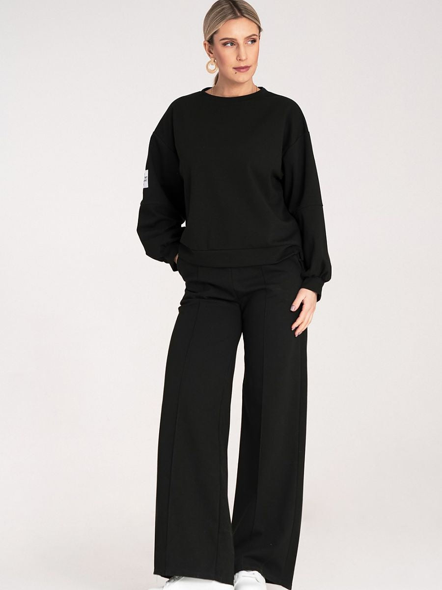 Black tracksuit set. Loose sweatshirt with long, wide sleeves and a round neckline, and wide pants with an elastic waistband and drawstring.