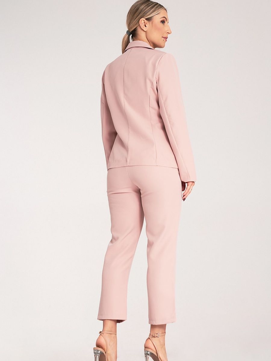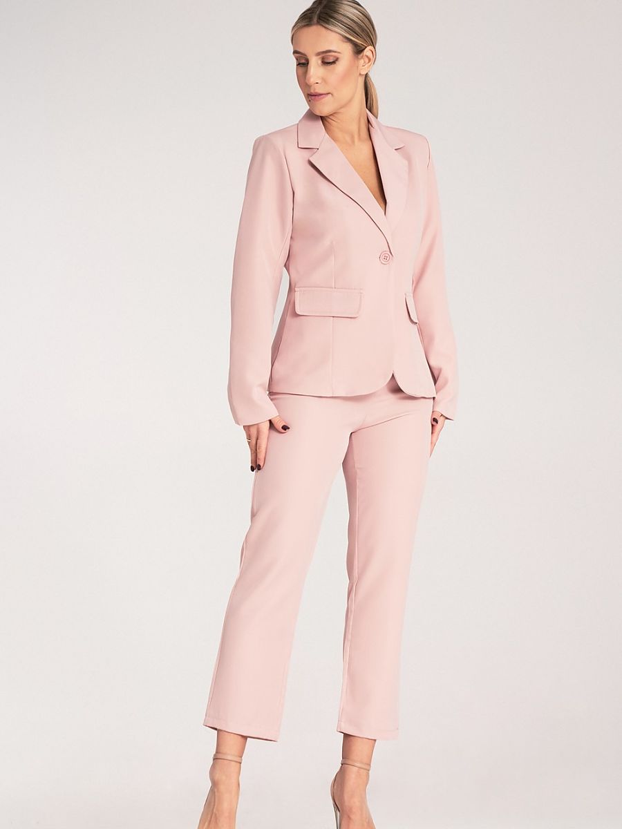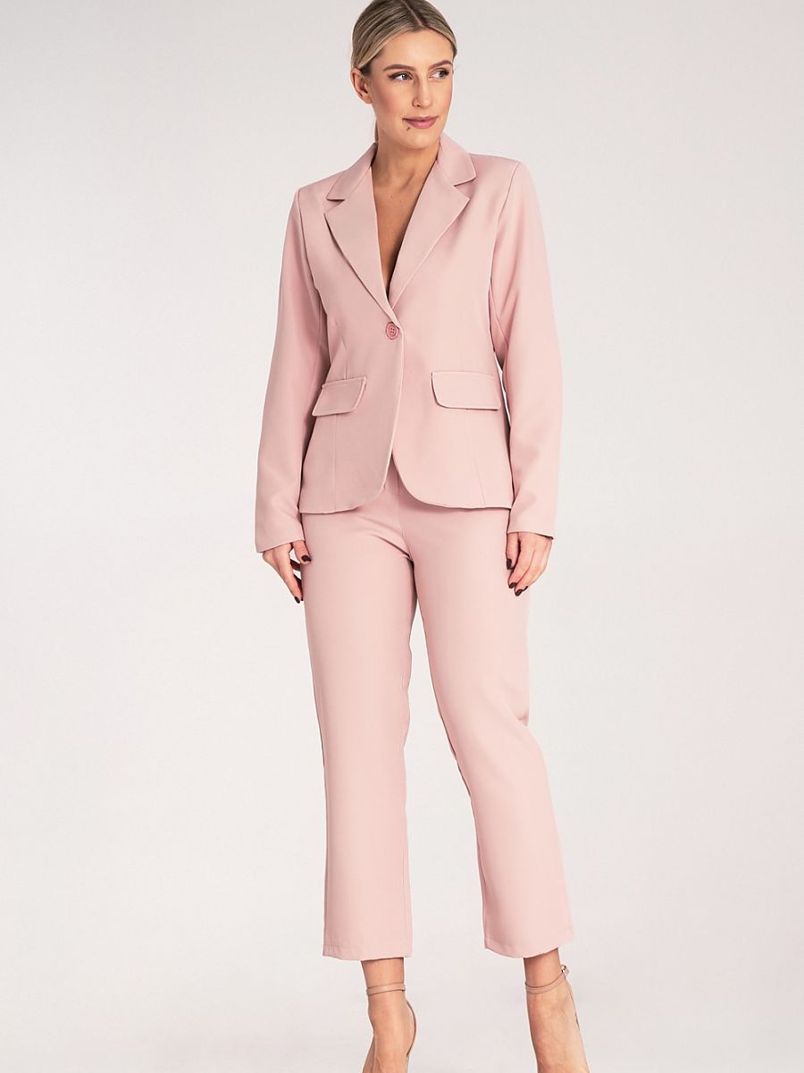 Elegant women's suit. Classic blazer with one button closure and high-waisted, fitted trousers with pockets.