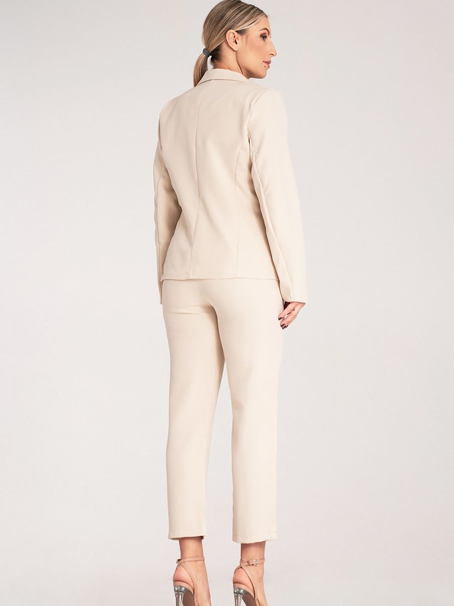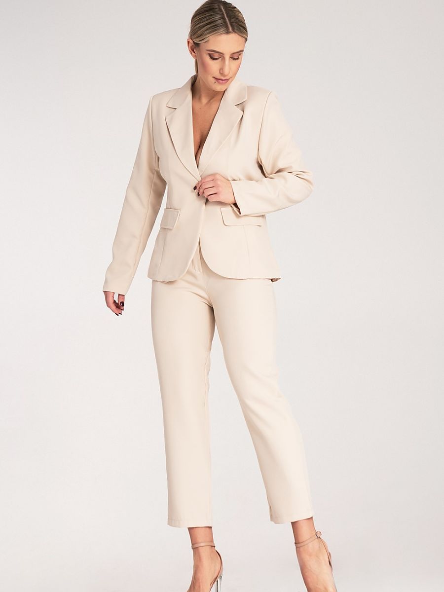 Stylish women's suit. Classic blazer fastened with one button and fitted high-waisted trousers with pockets.