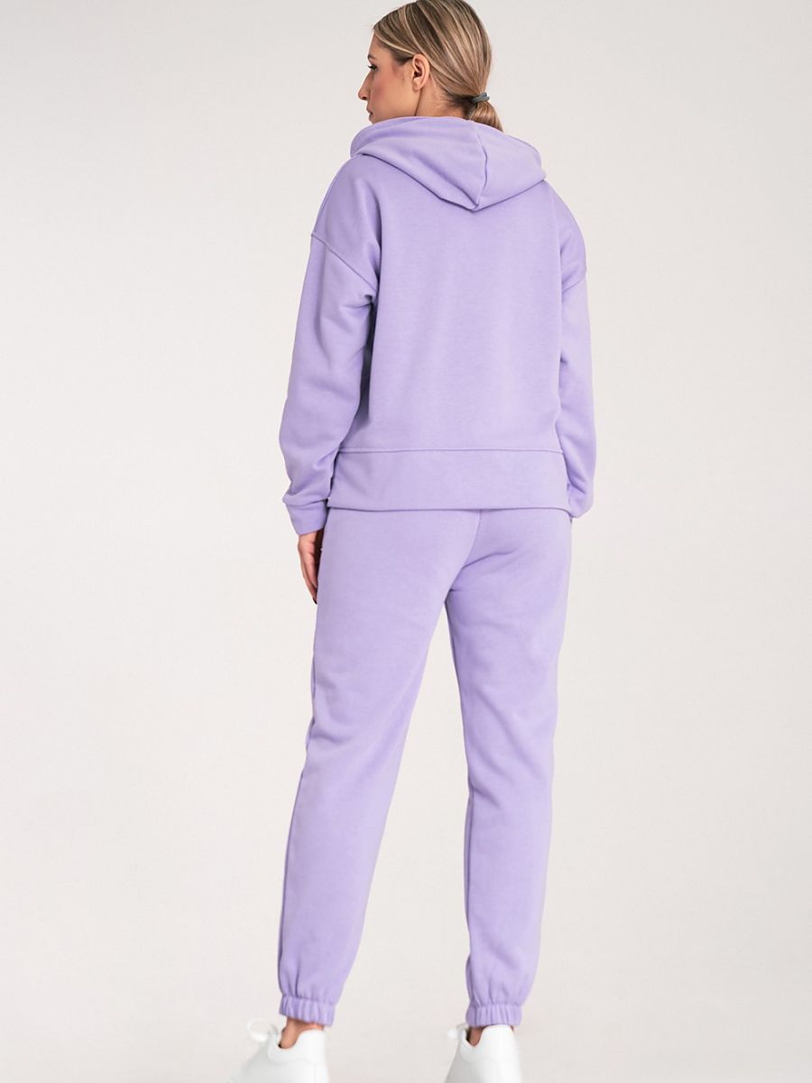 Sweat suit consisting of a comfortable hoodie with a hood and pants with an elastic waistband. The hoodie has a loose fit with contrasting drawstrings at the hood. The pants have an adjustable waist and practical pockets.