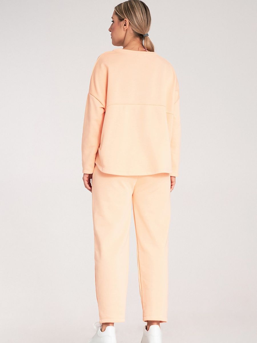 Sweatsuit set. Loose sweatshirt with long sleeves and a round neckline, and pants with an elastic waistband, tied with a drawstring.