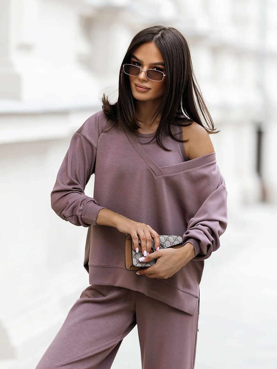 Stylish women's set created with comfort and feminine look in mind. It consists of three perfectly fitted elements. A sweatshirt with long sleeves and a V-neck that subtly emphasizes the neckline. The bottom of the sweatshirt is asymmetrical, slightly longer at the back, which gives the whole outfit a modern character and ensures freedom of movement. A tank top with classic, round neckline, serving as a universal base for many stylizations, perfect for wearing solo or under a sweatshirt. Long pants with a comfortable elastic waistband and additional tying, allowing for individual adjustment. Slip pockets increase functionality, and the slightly flared legs towards the bottom add lightness and fit into a fashionable, casual style. A perfect set for everyday wear, combining comfort with feminine aesthetics. It will work great both in the comfort of home and in more casual, urban stylizations.