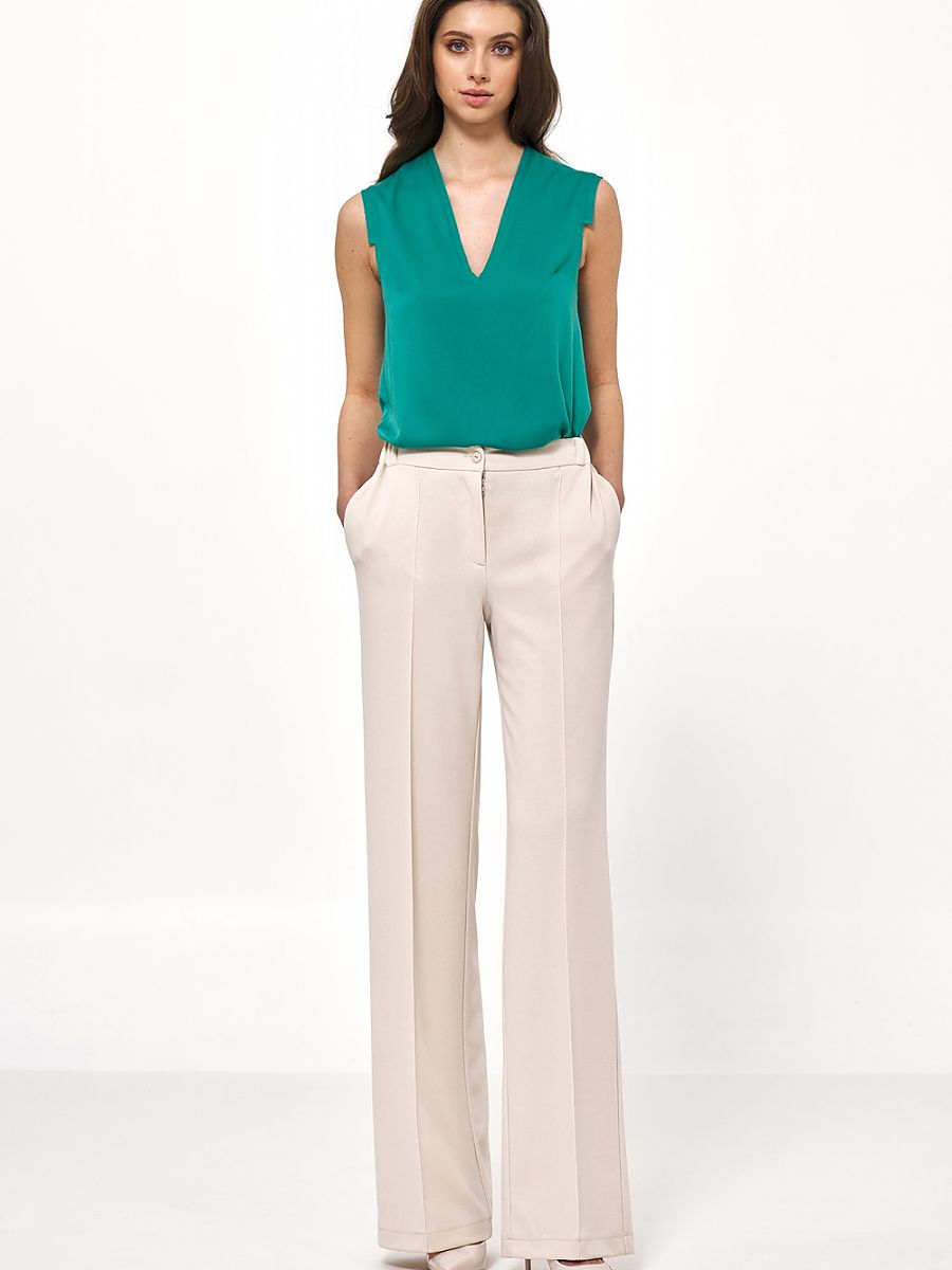 Elegant beige loose cut pants will create a harmonious duo with an airy blouse and oversize jacket of the same color. This model of pants will optically lengthen the legs, and the elevated top will emphasize the waist. The material ensures comfort of wearing.